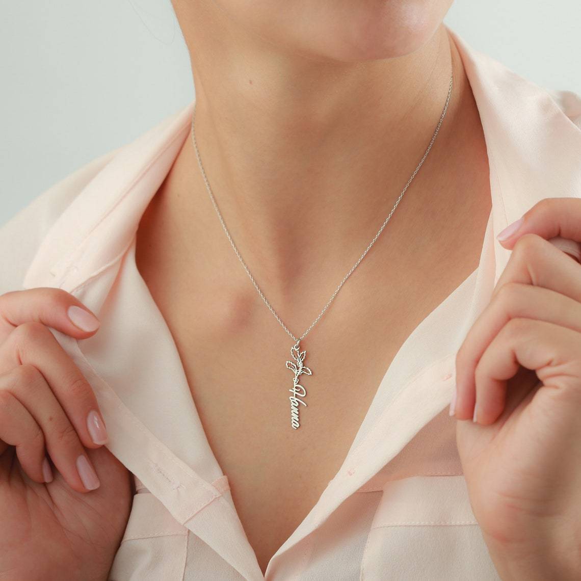 Le collier prénom avec fleur de naissance allie signification personnelle et design élégant. Fabriqué en argent 925 de haute qualité, le collier porte un pendentif gravé individuellement avec ton nom et la fleur de naissance qui symbolise ton mois de naissance.