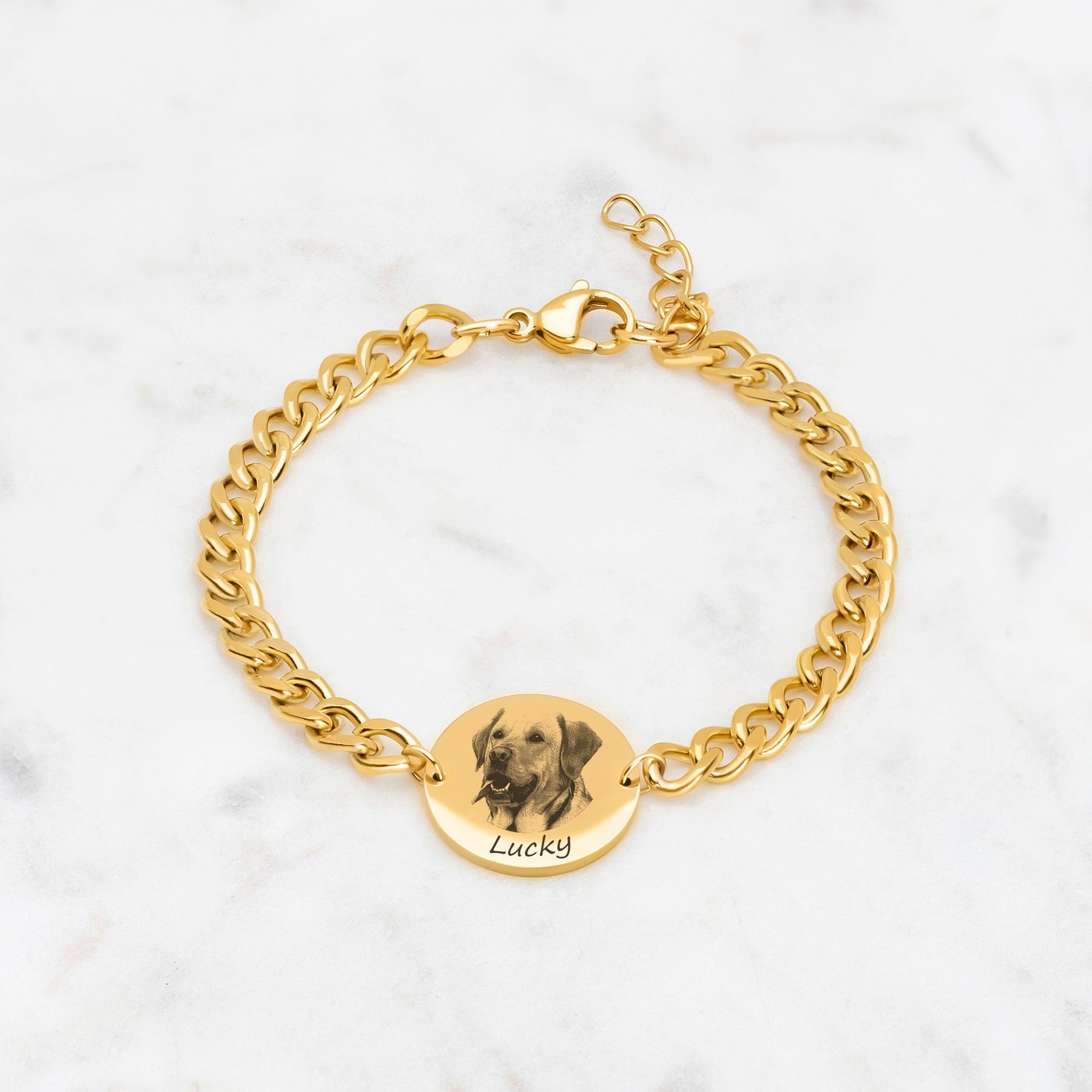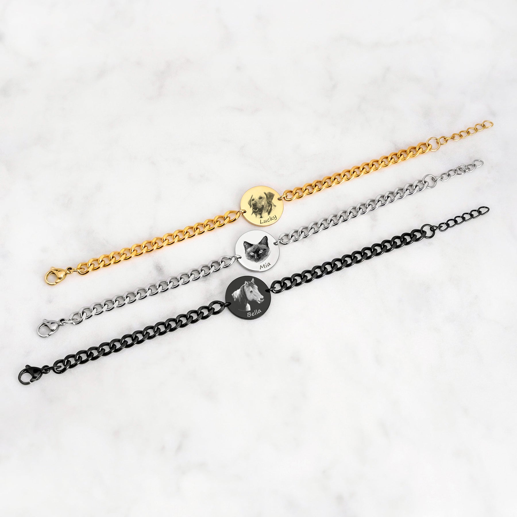 Avec notre bracelet gravé photo personnalisé, vous pouvez toujours porter vos moments les plus précieux avec vous. Qu'il s'agisse d'une photo de vos proches, de votre animal de compagnie ou d'un moment inoubliable – nous gravons votre photo avec précision sur un pendentif élégant. Ainsi, votre bracelet devient un bijou unique et personnel.