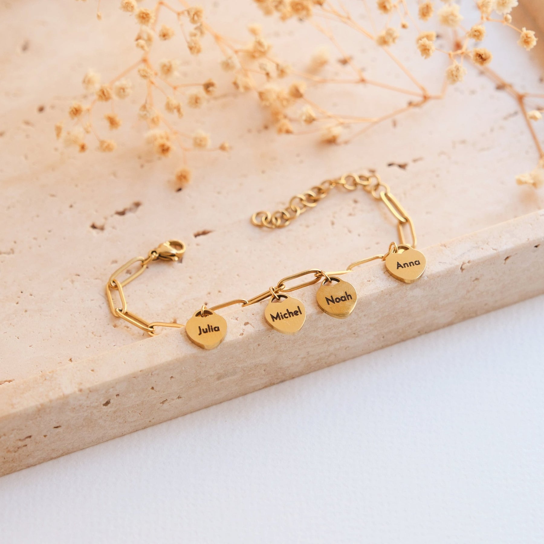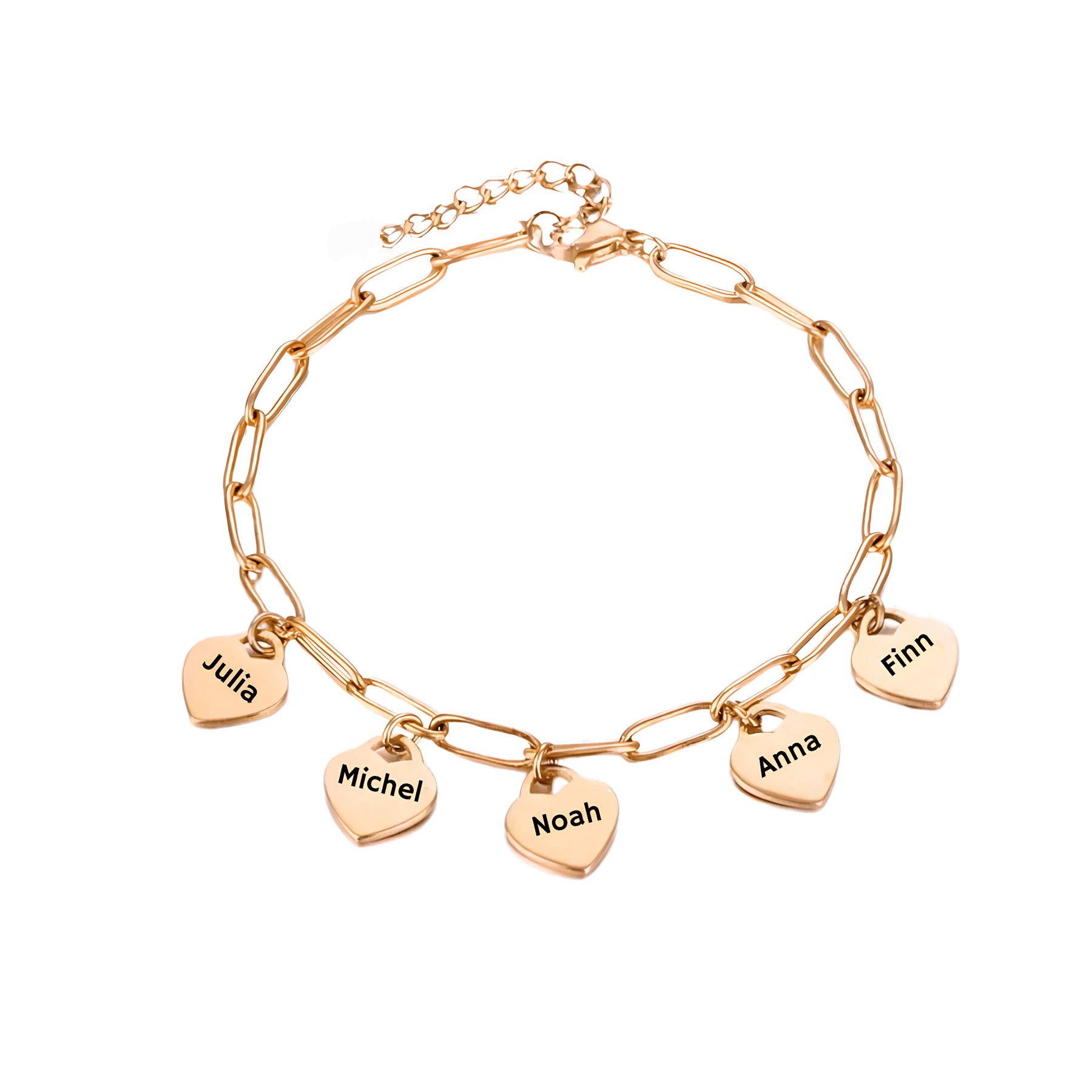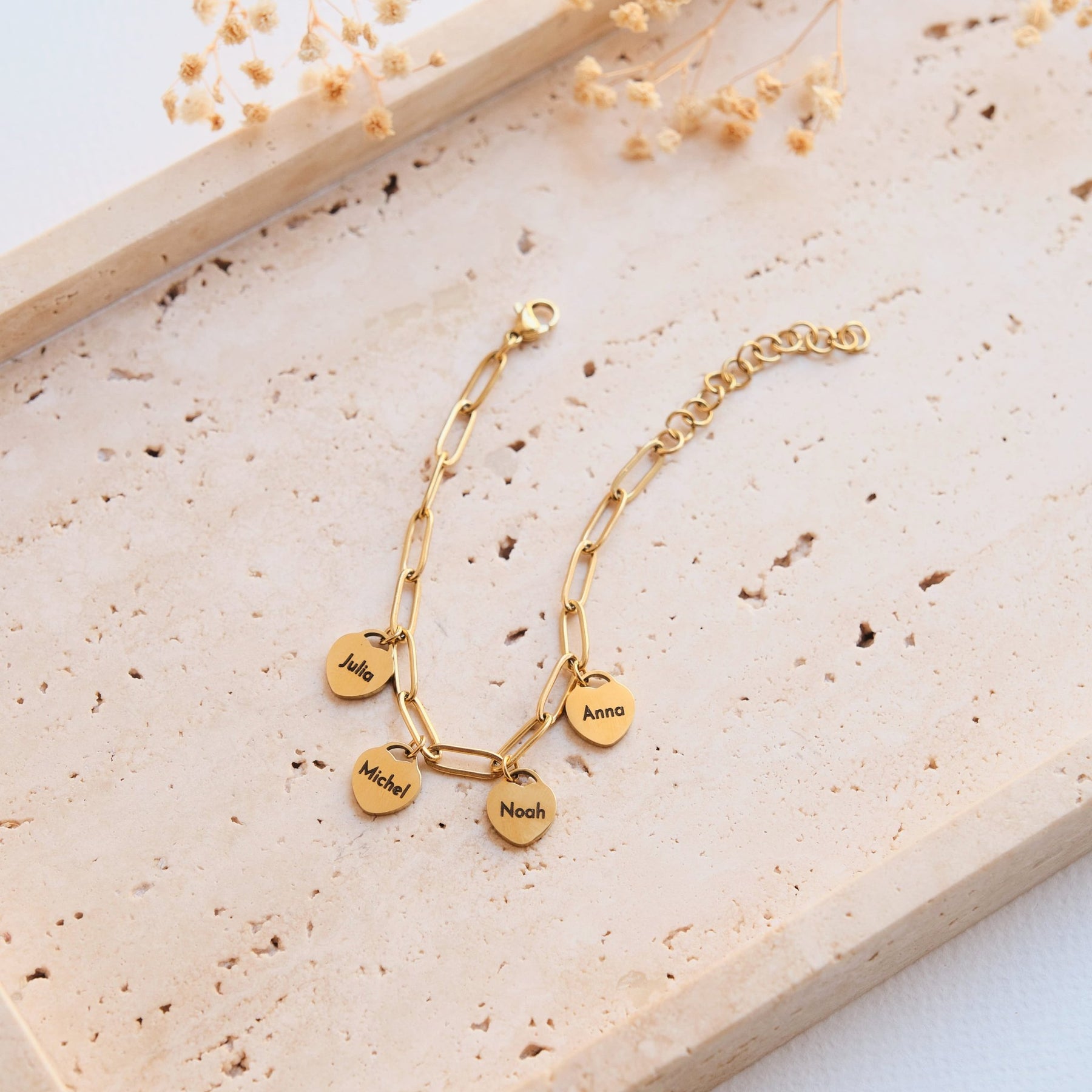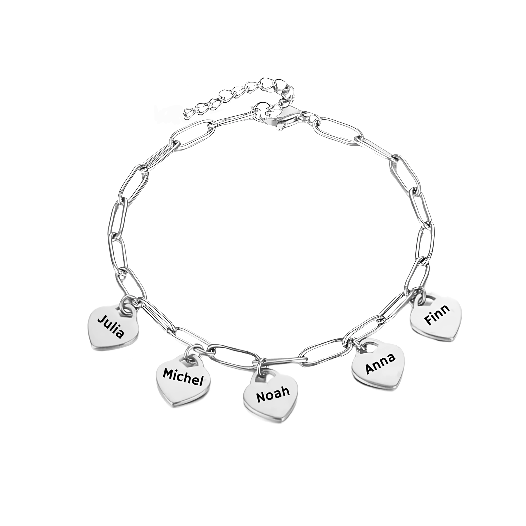 Dit fijne armbandje met hartbedeltjes wordt gemaakt van hoogwaardig, waterbestendig roestvrij staal en is het perfecte accessoire voor bijzondere momenten. De kleine hartbedeltjes kunnen individueel worden gepersonaliseerd met namen, initialen, data of korte boodschappen – ideaal als cadeau voor de beste vriendin, zus, mama of partner.