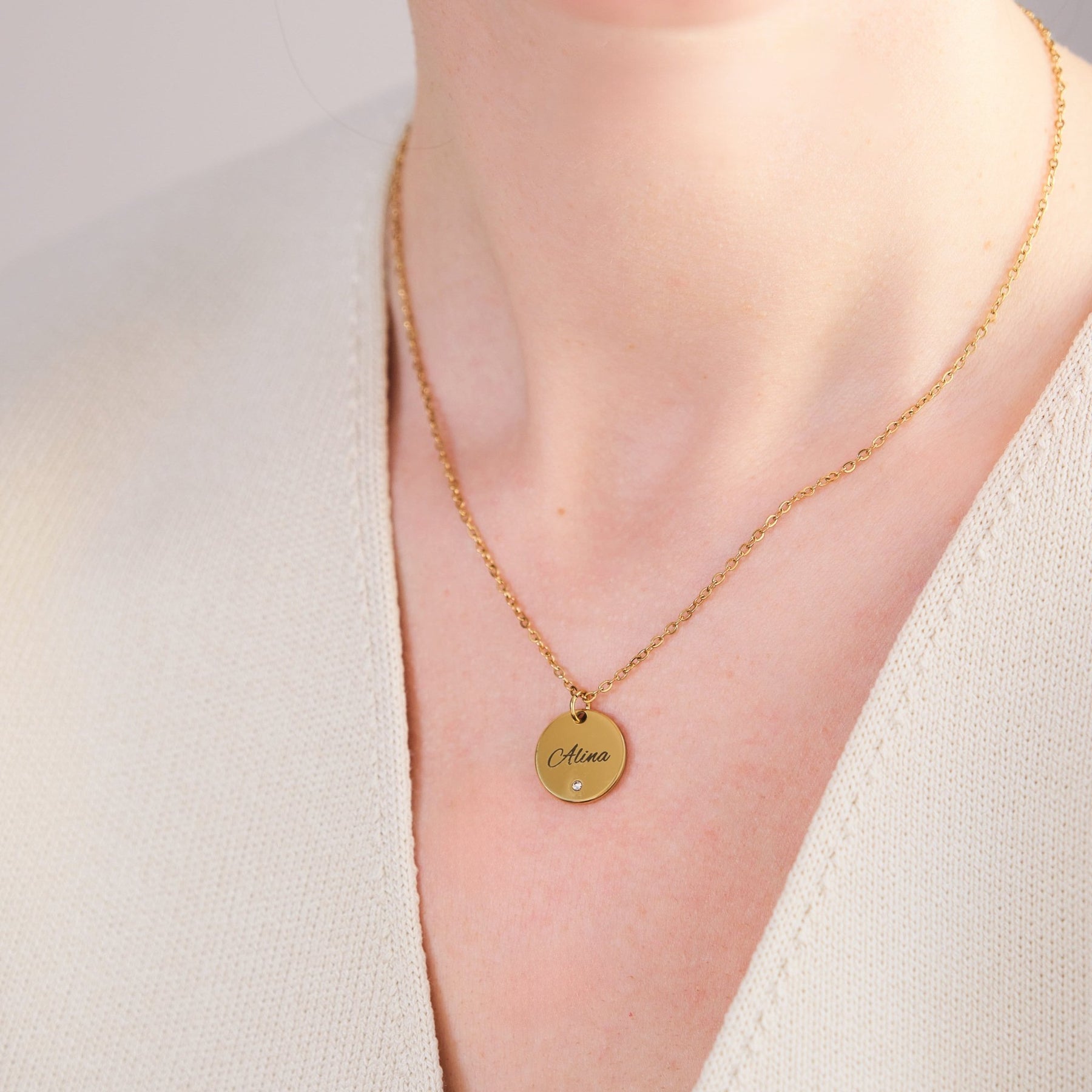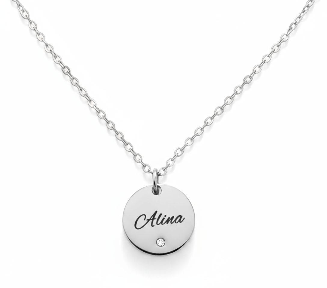 Diese stilvolle Halskette mit rundem Anhänger und funkelndem Zirkonia wird durch deine persönliche Gravur zu einem einzigartigen Schmuckstück. Der Name, den du eingravieren lässt, verleiht der Kette eine ganz besondere Bedeutung – ideal als Geschenk oder zum Selbsttragen.