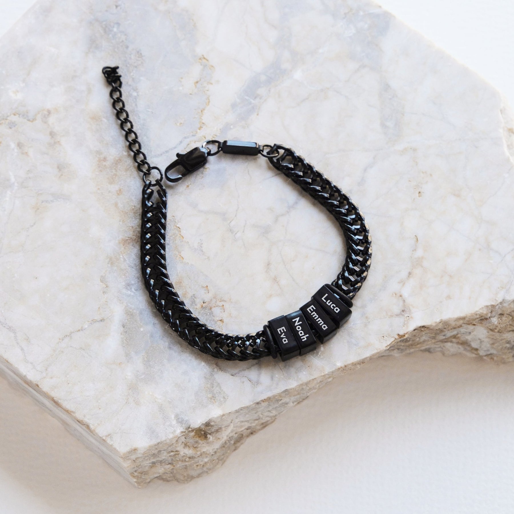 Zeig, wie viel Dir Deine Liebsten bedeuten – mit diesem stilvollen Armband aus hochwertigem, schwarzem 316L Edelstahl. Die edlen Würfelperlen lassen sich mit Namen oder kurzen Worten individuell gravieren – ideal für die Namen der Kinder oder Enkel.